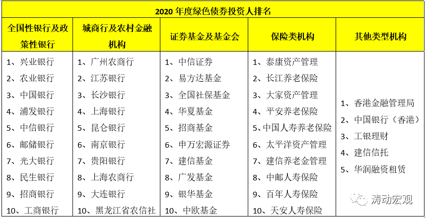 2021年1月12日,交易商協會在其官方微信號上公示了2020年度綠色債券投資人排名(根據投資人參與綠色債務融資工具的投資程度)。可以看出,全國性銀行中興業銀行、農業銀行、中國銀行、浦發銀行和中信銀行排名前五,城商行及農村金融機構中廣州農商行、江蘇銀行、長沙銀行、上海銀行和昆侖銀行位居前五,其它如理財公司等亦有參與。