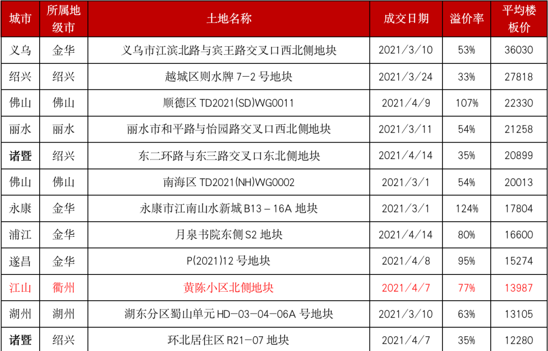 在此之前不久,2021年4月7日,浙江省衢州江山市黃陳小區北側地塊出讓,起拍價26266萬元,起始樓面價7924元/平方米,經296輪競價,該地塊最終由浙江萬榮湖北房地產有限公司以46366萬元競得,樓面價13987.15元/平方米,溢價率76.52%,樓面地價再創新高,這距離上宗“單價地王”誕生僅過去兩個月。