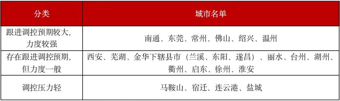 從中央近期表態、住建部多次約談熱點城市來看,這些市場表現較熱的城市均存在調控預期,特別是近期高溢價地塊頻出、整體溢價率處于高位的南通、紹興、東莞、溫州等城市,后續加碼調控的可能性更高,政策力度也會有明顯收緊趨勢。