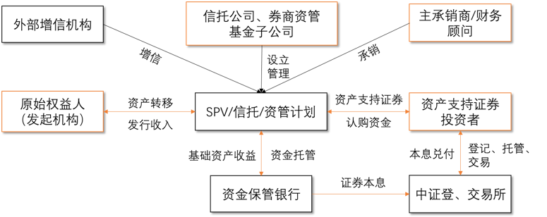 如上圖所示,這個(gè)資產(chǎn)包是一個(gè)特殊目的載體,需要一個(gè)管理人(或叫受托人),通常是信托公司或者其他履行相同職能的類似機(jī)構(gòu)(本文討論服務(wù)信托,姑且以信托公司為例)。資產(chǎn)證券化與一般財(cái)產(chǎn)信托的差異就在于,前者在封包并創(chuàng)設(shè)了“信托受益權(quán)”(就是獲得信托財(cái)產(chǎn)和信托利益分配的權(quán)利)后,這個(gè)信托受益權(quán)被標(biāo)準(zhǔn)化、證券化,并公開出售給投資者。在資產(chǎn)證券化的交易場景中,我們一般將該“信托”稱之為“資產(chǎn)支持計(jì)劃”,對應(yīng)出售給投資者的權(quán)益憑證稱之為“資產(chǎn)支持證券”。