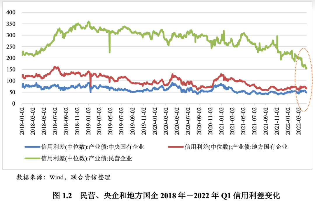自2018年以來,民營企業債券凈融資額的變化以及其與國企的差異反映出其整體在外部融資環境的負面沖擊下,所面臨的融資難困境。2018年-2022年1季度,民企債券凈融資額除2020年上半年和2022年一季度短暫為正外,其余季度均為負值,特別是各年的下半年,民企凈融資額負值均較大;而同期國企凈融資額均為正值,特別是民企為正值時,國企凈融資更高,兩者分化進一步加劇。這說明市場整體環境較差、外部融資環境負面沖擊較大時,民企融資非常困難;市場環境放松時,民企融資雖然好轉,但從獲利力度上不如國企。