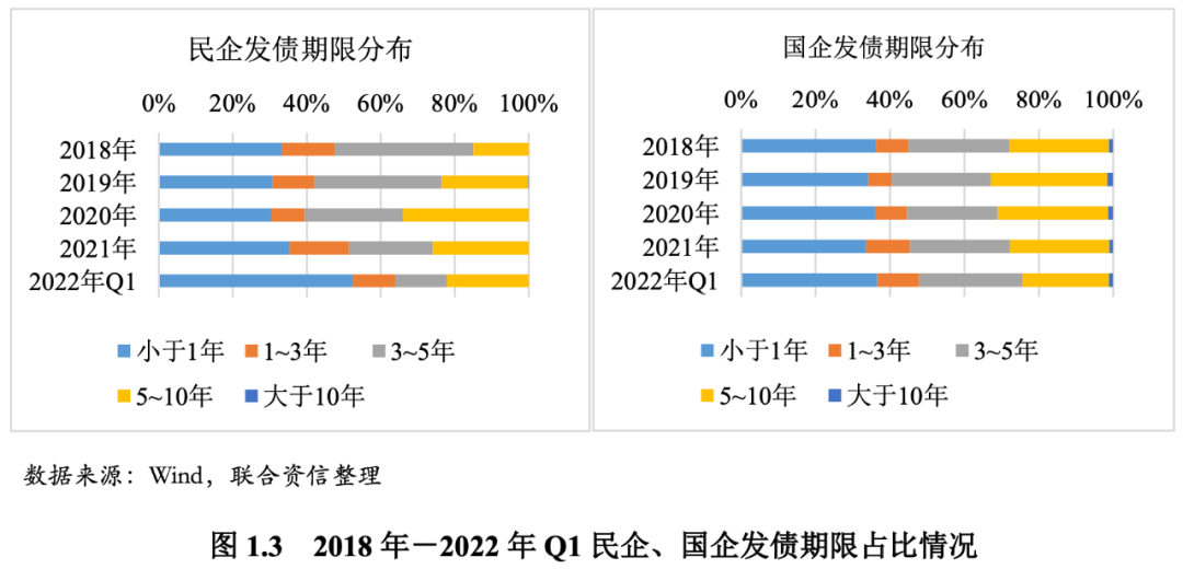 自2018年以來,民營企業發債期限越來越短,2022年新發債券中1年期以下占比已超過一半,反映出民企在外部信用環境變差的情況下,所面臨的流動性緊張困境。從發行期限的分布來看,民營企業自2018年起新發債券中,中短期占比越來越高,1年以內的新發債券占比已經從2018年的33%增長至2022年1季度的52%。與民營企業相比,同期國有企業各年新發債券期限分布則較為均衡。民企發債期限越來越短,一方面表明民企流動性較為緊張,需頻繁地借新還舊。另一方面也凸顯市場對投資民企信心不足,更趨謹慎。