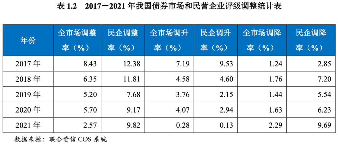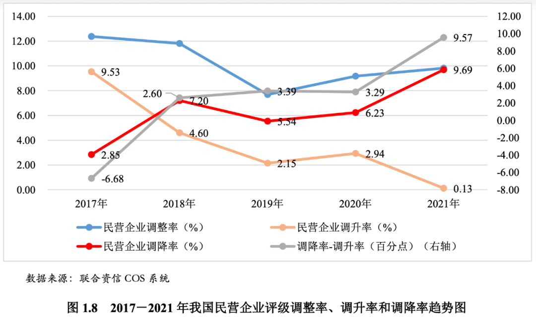 自2018年以來,民營企業的信用評級變化反映出其整體信用能力不斷弱化,信用評級機構通過評級調整對民營企業的違約風險進行了提示和預警。從評級調整看,2017-2021年間,民營企業的評級調整率先降后升,評級調升率整體呈下行趨勢,而評級調降率則整體呈上升趨勢。與整個債券市場相比,民營企業的評級調整率明顯高于債券市場總體,評級調升率整體低于債券市場總體,評級調降率則顯著高于債券市場總體。2017年,民營企業的評級調升率尚高于評級調降率6.68個百分點,但自2018年發生逆轉,其評級調降率顯著高于評級調升率,直至2021年評級調降率高于評級調升率9.57個百分點,見圖1.8。