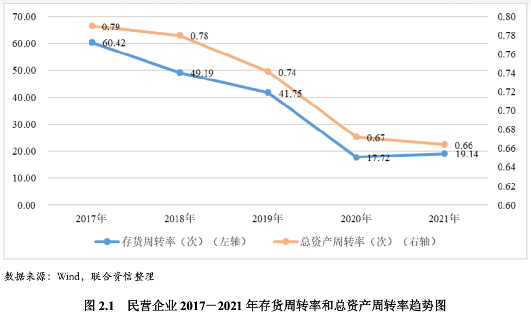 2018年以來,民營企業的經營效率整體呈下行走勢。從樣本企業的存貨周轉率均值來看,2018-2020年同比分別下降11.23次、7.44次和24.03次,反映出民營企業銷售不暢,存貨積壓較為嚴重。2021年我國經濟從疫情中快速復蘇,民營企業的存貨周轉率有所反彈,同比上升1.42次,但相比2017年仍處于底部區域。從樣本企業的總資產周轉率均值看,2018-2021年間呈持續下行趨勢,其中2019年和2020年降幅較為明顯,分別下降0.04次和0.07次。總體來看,自2018年以來,在信用環境、新冠疫情、供應鏈不暢和全球經濟復蘇乏力等因素沖擊下,我國民營企業的經營效率下降較為顯著,目前仍在底部區域徘徊。今年由于新冠疫情的散發和多發,我國各地加強了封控和管控措施,部分民營企業被迫停工停產,經營效率可能進一步下行。