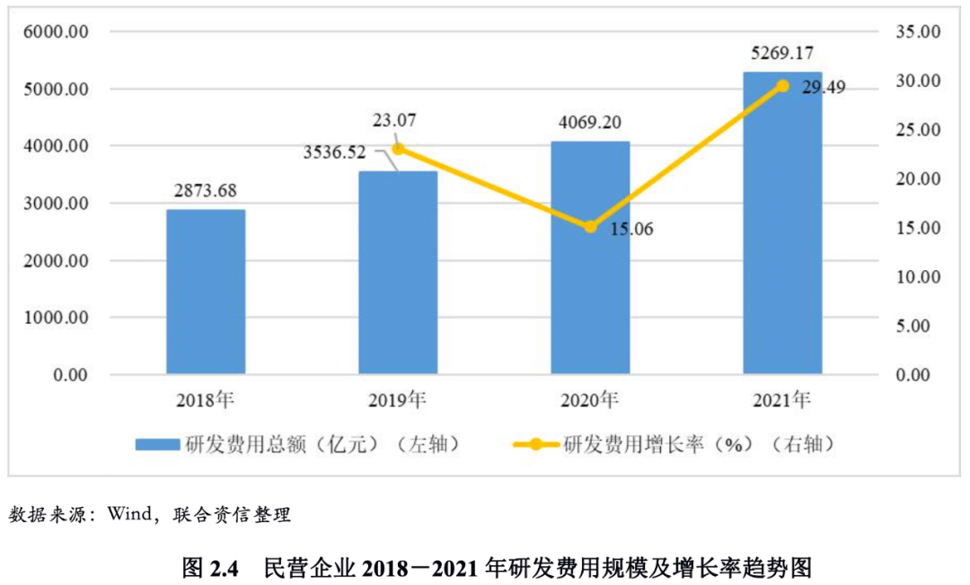 由于盈利能力下降,現金流收緊,民營企業對未來的預期趨于謹慎,在長期資產和研發方面的投入增速出現較大波動。為保證數據的可靠性,本報告采用現金流量表中的“購建固定資產、無形資產和其他長期資產支付的現金”科目作為長期資產投資的統計數據。2017-2021年間,民營企業的長期資產投資規模整體呈增長趨勢,但增速出現較大波動,2019年長期資產投資增長率僅4.93%,比上年大幅下降31.32個百分點,2020年隨著鼓勵民企投資政策的出臺,長期資產投資增速出現反彈,2021年我國經濟從疫情中顯著復蘇,帶動民企長期資產投資增速進一步走高。由于“研發費用”在利潤表中單獨列示自財政部發布《關于修訂印發2018年度一般企業財務報表格式的通知》財會〔2018〕15號后開始,因此對“研發費用”的統計期間為2018-2021年,該期間研發費用規模呈增長態勢,但增速也出現波動,2020年同比增長率為15.06%,比上年下降8.01個百分點,2021年由于加大研發費用在所得稅中加計扣除的稅收優惠政策推出和經濟的快速復蘇,民營企業的研發費用增速出現反彈。由于新冠疫情防控的收緊,國際局勢動蕩和經濟增速減弱,2022年民營企業的長期資產投資和研發投入的增速可能再次走低。