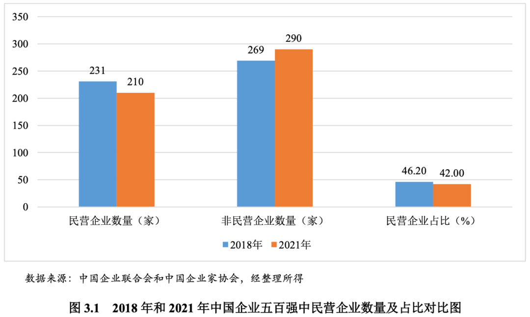 我們采用中國企業聯合會和中國企業家協會聯合發布的中國企業五百強名單,通過對比分析民營企業2021年和2018年在五百強名單中的數量占比和排名變化來分析其整體市場競爭力的變化。2018年,中國企業五百強名單中有231家民營企業,所占比例為46.20%;2021年,中國企業五百強名單中民營企業為210家,減少21家,所占比例為42.00%,下降4.20個百分點,由此可見民營企業的整體市場競爭地位有所下降。從排名看,與2018年相比較,2021年有87家民營企業的排名上升,但有144家民營企業排名下降,其中63家民營企業退出了五百強名單,民營企業的市場地位總體上出現明顯下降。在2018年中國企業五百強中,有36家企業發生債務違約,其中民營企業28家,占比超過四分之三;發生債務違約的28家民營企業,有18家退出五百強名單,7家排名下降,僅3家排名上升,可見債務危機是導致民營企業市場地位下降的重要原因之一。