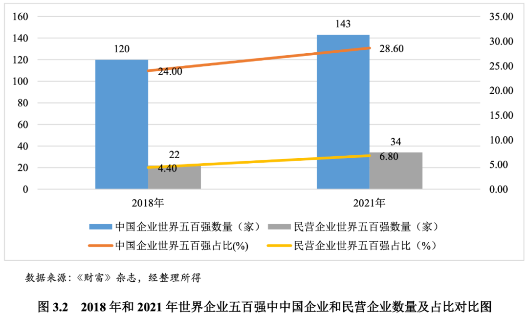 根據《財富》雜志的世界五百強排名,2021年有143家中國企業入圍,比2018年增加23家,所占比例為28.60%,比2018年提高4.60個百分點,其中民營企業為34家,比2018年增加12家,所占比例為6.80%,比2018年提高2.40個百分點。由此可見,中國企業在全球經濟中的競爭地位顯著提升,民營企業在全球經濟中的競爭地位也有所上升。