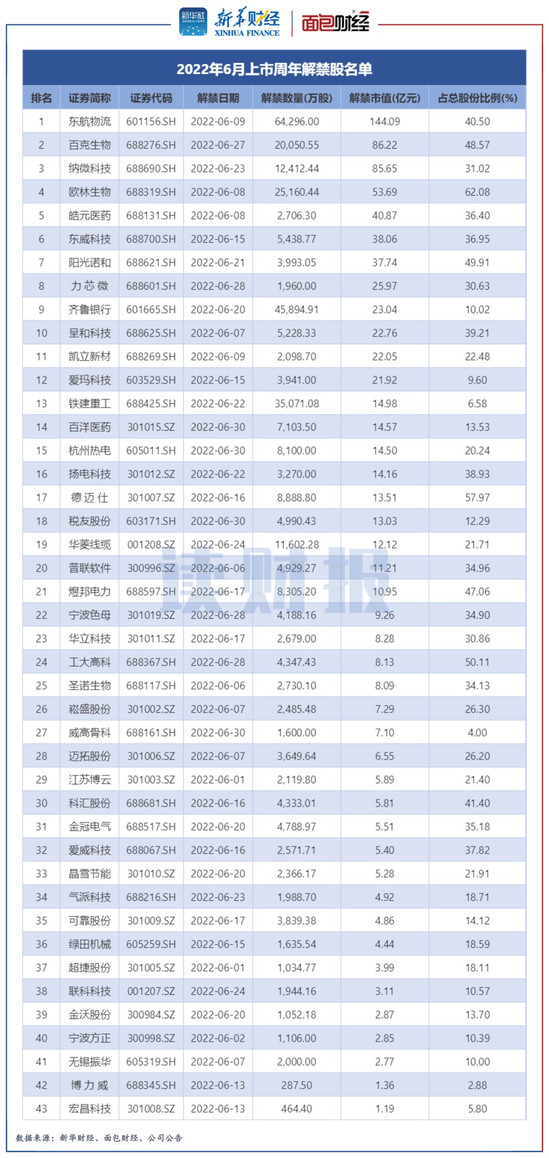 此外,共有43家公司、33.87億限售股于6月迎上市周年解禁,解禁市值逾800億元,包括東航物流、百克生物等企業。