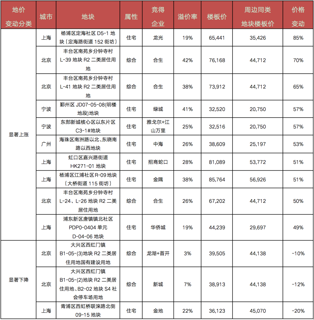 高價地價格變動情況來看,將二季度以來成交的樓板價TOP50地塊的樓板價與其周邊近期同類地塊樓板價對比,超九成高價地樓板價較之前均有上漲,八成地塊樓板價漲幅超過10%,漲幅較高的多位于京、滬供地稀缺的核心板塊。
