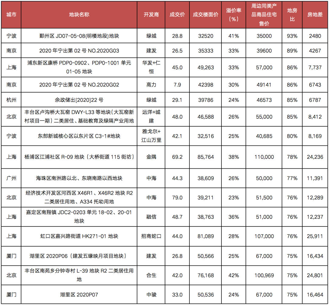 典型如綠城摘得的寧波鄞州區JD07-05-08(明樓地段)地王項目,該地塊樓板價達到32520元/平方米,而周邊在售的建邦·璟譽府均價為35000元/平方米,地房比高達93%,房地差僅有2480元/平方米。
