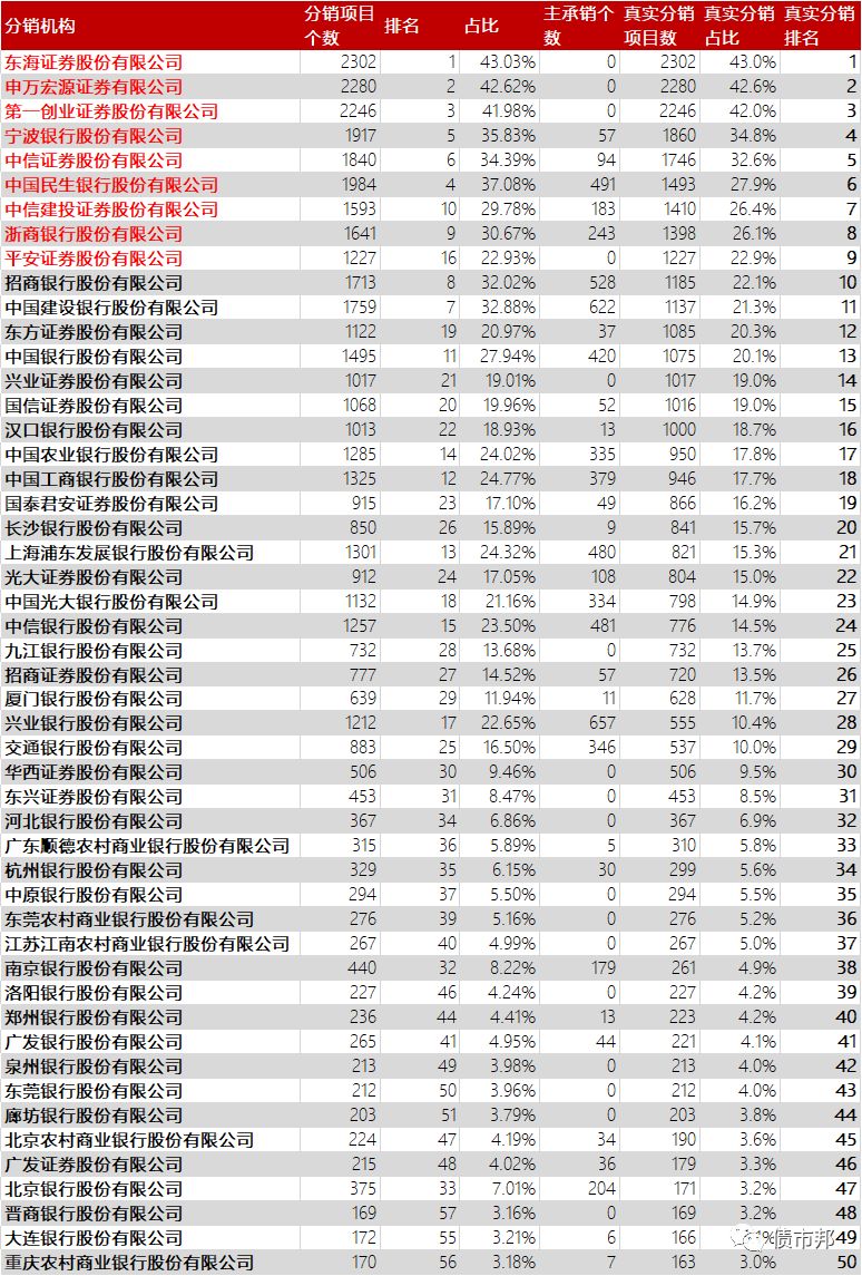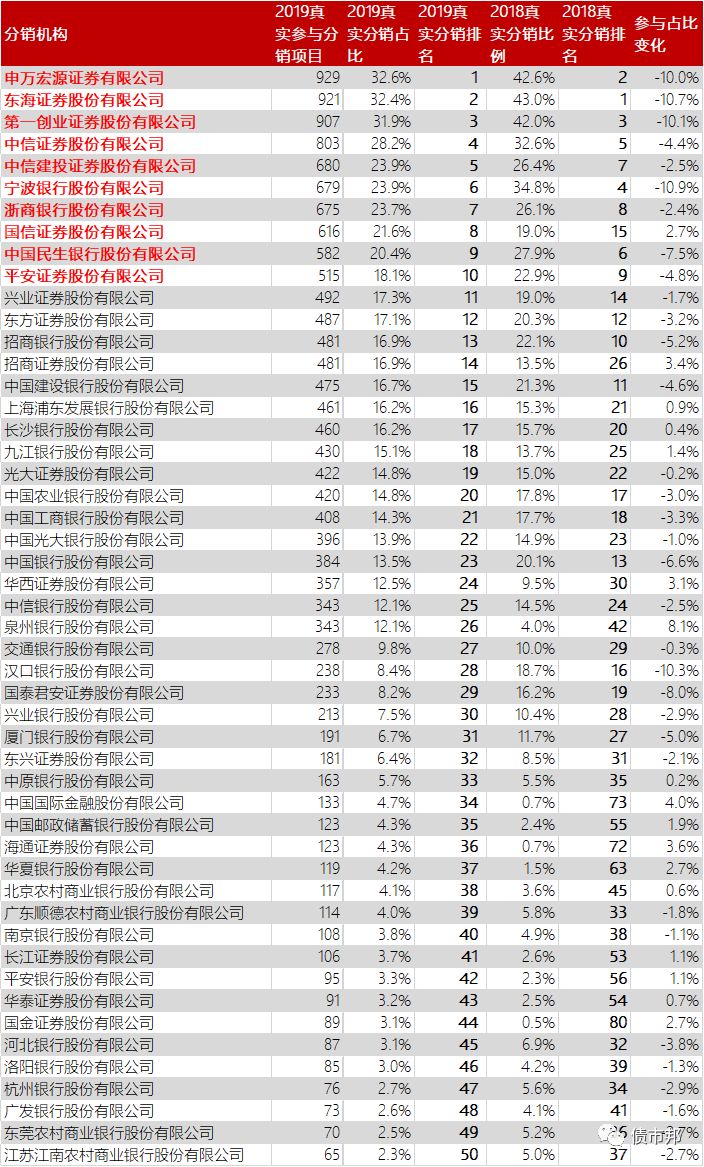 因為主承銷商天然就是承銷團(tuán)員,而狹義上的分銷是承銷團(tuán)員參與銷售非所在機構(gòu)主承的債務(wù)融資工具的行為,為了更好地進(jìn)行對比,將主承項目剔除后作為真實分銷項目進(jìn)行排名出來的TOP50,結(jié)果如下所示。