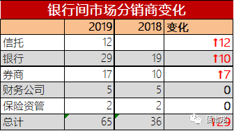 從數(shù)量上來看,2019年具有參團(tuán)分銷資格的市場成員,從2018年初的36家快速上升到65家,其中信托公司和銀行成為新增主力,分別達(dá)到12家和10家。背后其實體現(xiàn)的就是微觀經(jīng)濟學(xué)的樸素原理——行業(yè)出現(xiàn)超額利潤會吸引更多的競爭者進(jìn)入,最終會降低行業(yè)的整體利潤水平。