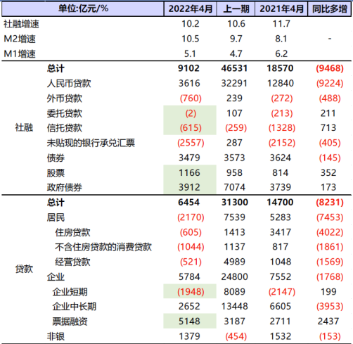 2022年4月,社會融資規模增量為9102億元,比上年同期減少9468億元,其中,對實體經濟發放的人民幣貸款增加3616億元,同比少增9224億元。可以看到社融新增規模大幅下降一半以上,而這主要是來自于實體經濟貸款額的下降。