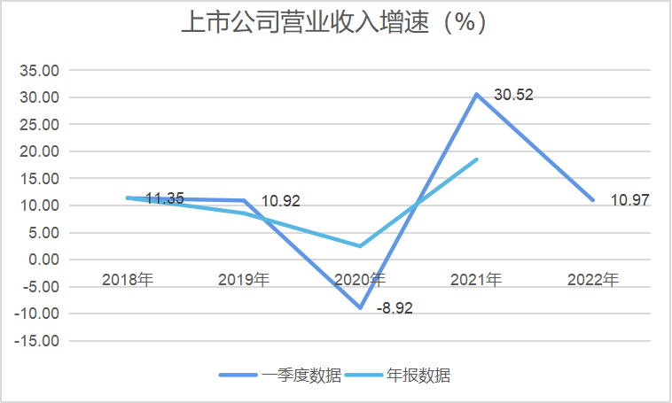 2022年一季度A股公司實現收入16.49萬億元,同比增速為10.97%,與疫情前的2018-2019年一季度相當。收入的增長代表著經濟總產值的增長,這一數據與一季度國內GDP增長趨勢相符。