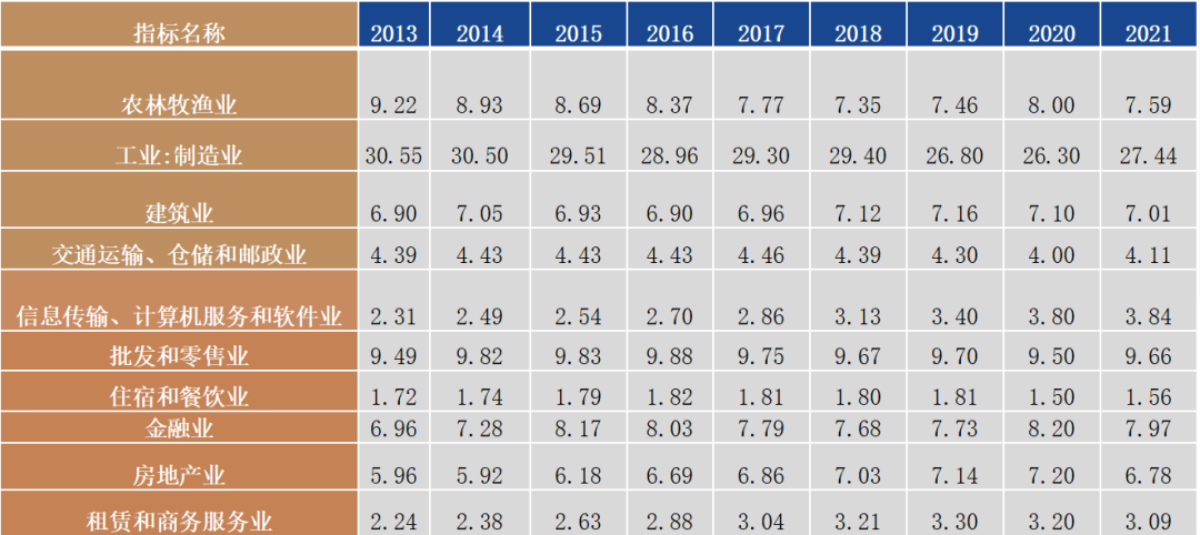 從國家GDP的構成來看,工業制造業一直是國家經濟的第一大支柱產業,盡管近些年來工業制造業增加值在GDP的占比中持續下降,但其2021年仍舊貢獻27.44%行業增加值,仍然是第一大行業。