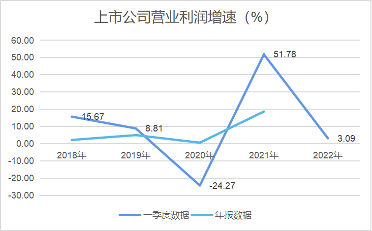 但是,2022年一季度A股公司營業利潤的增速僅3.09%,不僅遠低于收入的增速,也遠低于疫情前2018-2019年一季度的增速。