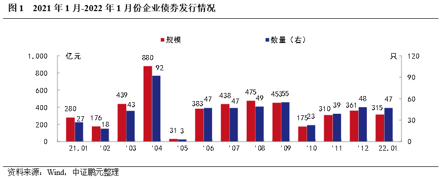 2022年1月企業(yè)債券發(fā)行47只,發(fā)行規(guī)模315.30億元,較上月分別下降2%和13%,較上年同期分別增長(zhǎng)74%和13%,發(fā)行規(guī)模近月維持相對(duì)穩(wěn)定。
