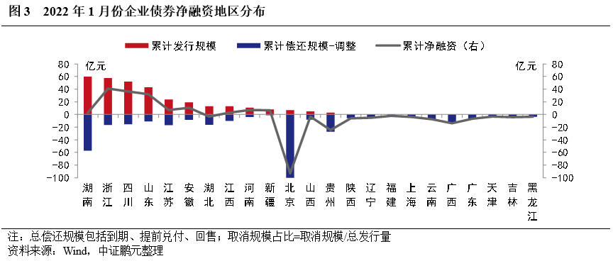 從地區(qū)分布看,2022年1月份多省企業(yè)債凈融資以凈償還為主。具體看,浙江、四川和山東分別實(shí)現(xiàn)凈發(fā)行41、36和32億元、遠(yuǎn)高于其他省份。北京因償還規(guī)模較大,當(dāng)月凈融資規(guī)模-93億元。此外,陜西、遼寧等10個(gè)省份本月未發(fā)行企業(yè)債,以償還為主。