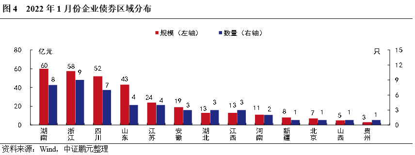 2022年1月,共有13個(gè)省份發(fā)行了企業(yè)債券。其中,湖南和浙江分別發(fā)行59.90和57.50億元,規(guī)模高于其他省份,其次,四川和山東分別發(fā)行51.90和43億元。與上年同期相比,本月除湖北和山東發(fā)行規(guī)模出現(xiàn)下滑,其余省份均出現(xiàn)增長(zhǎng),其中,四川同比增長(zhǎng)419%,漲幅最大,其次是湖南,增長(zhǎng)344%。此外,山西發(fā)行5億元企業(yè)債券,為2021年來首次發(fā)行,發(fā)行主體為“山西建設(shè)投資集團(tuán)有限公司”,主體評(píng)級(jí)AAA。
