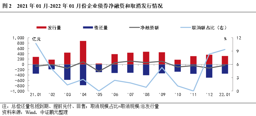 從凈融資情況來看,1月企業(yè)債券總發(fā)行規(guī)模315.30億元,總償還規(guī)模349.68億元,本月表現(xiàn)為凈償還34.38億元,上年同期為凈償還69.01億元。此外,2022年1月有2只企業(yè)債券取消發(fā)行,原計(jì)劃發(fā)行規(guī)模29.50億元,取消發(fā)行規(guī)模占比9.4%,為近一年峰值。2月,企業(yè)債待償還規(guī)模116.61億元,為近一年低位。本月回售壓力不大,僅2只含權(quán)債券,債券余額26.40億元。