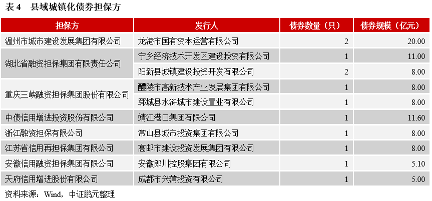 從主體級(jí)別看,AA級(jí)主體11家,AA+級(jí)主體3家,12只債券選擇增信發(fā)行,占比63%。其中,10只債券從AA增信至AAA,2只債券從AA+增信至AAA。從增信方看,擔(dān)保方共計(jì)8家,其中湖北省融資擔(dān)保集團(tuán)有限責(zé)任公司和重慶三峽融資擔(dān)保集團(tuán)股份有限公司分別對(duì)2家主體提供擔(dān)保,涉及省內(nèi)外。