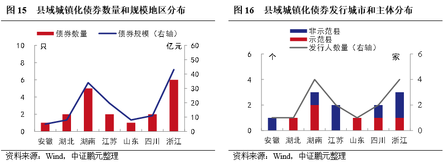 分城市看,目前有7個(gè)省份的12個(gè)城市發(fā)行過縣域城鎮(zhèn)化債券,其中,浙江和湖南為主要發(fā)行地區(qū),分別發(fā)行6只和5只,規(guī)模分別為43.10億元和34億元。分城市看,共有13個(gè)區(qū)縣參與發(fā)行,示范縣6個(gè),占比46%。除浙江桐廬縣和瀏陽市分別有2家發(fā)行人外,其余地區(qū)均有一家。