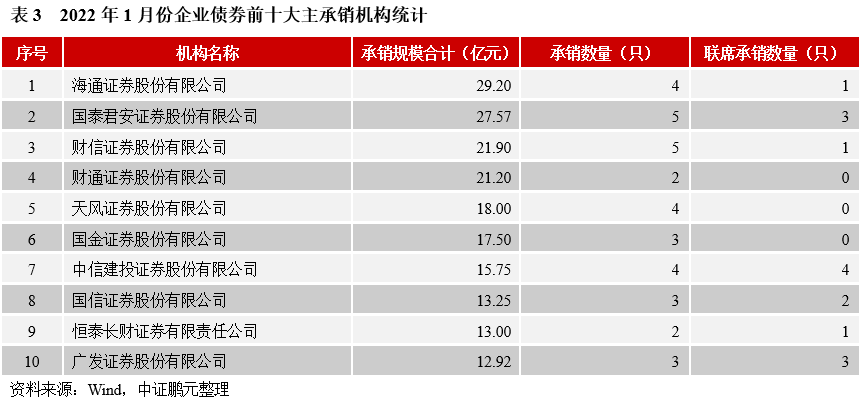 就承銷機(jī)構(gòu)而言,2022年1月共有28家機(jī)構(gòu)參與企業(yè)債券的承銷工作。海通證券承銷29.20億元,位居第一;國(guó)泰君安證券承銷27.57億元,位居第二;財(cái)信證券承銷21.90億元,位居第三。