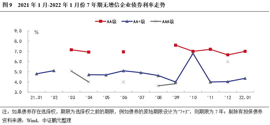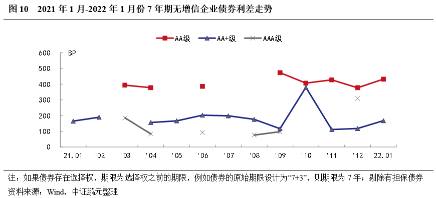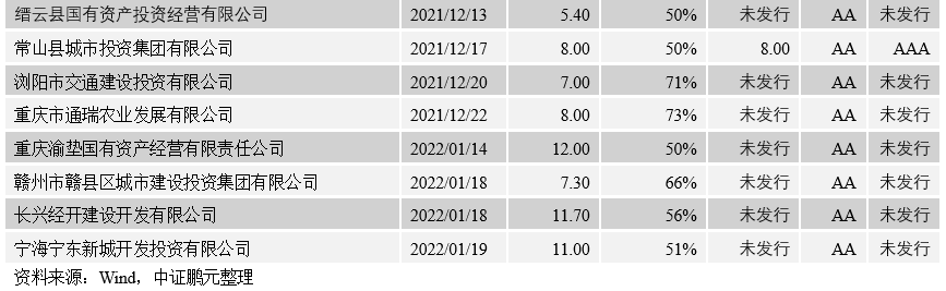2022年1月,企業(yè)債券期限分布于7年期等期限品種。其中,7年期品種發(fā)行36只,占比77%,發(fā)行規(guī)模203.30億元,占比65%;5年期品種發(fā)行5只,占比11%,發(fā)行規(guī)模34億元,占比11%。與上月相比,5年期和7年期品種發(fā)行規(guī)模占比較上月分別下降8.7和上升9個(gè)百分點(diǎn)。