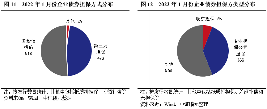 2022年1月,企業(yè)債有擔(dān)保的債券共計(jì)23只,數(shù)量占比49%,較上月上升3個(gè)百分點(diǎn),主要是AA+級(jí)主體增信比例上升。分主體級(jí)別看,AA級(jí)主體選擇增信發(fā)行的債券比重為77%,較上月下降3個(gè)百分點(diǎn);AA+級(jí)主體選擇增信發(fā)行的債券比重為25%,上月均未增信。從擔(dān)保方類型看,專業(yè)擔(dān)保公司依然為主體擔(dān)保主體,占比38%。