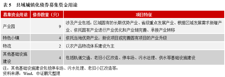 從募集資金用途看,目前主要集中在產(chǎn)業(yè)園建設(shè)和特色小鎮(zhèn)兩個(gè)領(lǐng)域,其他方面包括物流、停車場(chǎng)、污水處理、老舊小區(qū)改造等城市基礎(chǔ)設(shè)施建設(shè)。第一,產(chǎn)業(yè)園發(fā)展因地而異。發(fā)展較早的地區(qū)進(jìn)入園區(qū)整合優(yōu)化階段,包括園區(qū)整合、數(shù)字化改造以及產(chǎn)業(yè)鏈升級(jí)、完善等。例如,“22新城債”,募集資金用于浙江省大力推動(dòng)的新材料產(chǎn)業(yè),以及當(dāng)?shù)亻L(zhǎng)期優(yōu)勢(shì)產(chǎn)業(yè)醫(yī)療器械領(lǐng)域,以及依托安防小鎮(zhèn)和醫(yī)療器械產(chǎn)業(yè)園而起步的電子器械產(chǎn)業(yè)園。部分地區(qū)為推動(dòng)經(jīng)濟(jì)社會(huì)發(fā)展,新設(shè)產(chǎn)業(yè)園,以實(shí)現(xiàn)資源聚集。例如,2020年陽新縣納入縣城新型城鎮(zhèn)化建設(shè)示范名單,為滿足建設(shè)要求,解決產(chǎn)業(yè)基礎(chǔ)薄弱、吸納就業(yè)能力不足等問題,發(fā)行專項(xiàng)債券用于城北農(nóng)產(chǎn)品加工產(chǎn)業(yè)園項(xiàng)目。此外,寧鄉(xiāng)經(jīng)濟(jì)技術(shù)開發(fā)區(qū),為承接粵港澳大灣區(qū)美妝產(chǎn)業(yè)轉(zhuǎn)移,在區(qū)內(nèi)打造美妝谷項(xiàng)目。第二,特色小鎮(zhèn)建設(shè)依托當(dāng)?shù)貎?yōu)勢(shì)產(chǎn)業(yè),新設(shè)項(xiàng)目或完善固有項(xiàng)目的產(chǎn)業(yè)升級(jí)。例如,醴陵市經(jīng)開區(qū)五彩陶產(chǎn)業(yè)小鎮(zhèn),是湖南省首批省級(jí)特色產(chǎn)業(yè)小鎮(zhèn)示范項(xiàng)目之一,2021年發(fā)行專項(xiàng)債券用于小鎮(zhèn)產(chǎn)業(yè)鏈升級(jí),包括建設(shè)智能標(biāo)準(zhǔn)生產(chǎn)設(shè)施、技術(shù)研發(fā)轉(zhuǎn)化設(shè)施、倉儲(chǔ)集散回收設(shè)施和文化旅游體育設(shè)施。第三,響應(yīng)三農(nóng)政策,推動(dòng)農(nóng)產(chǎn)品物流體系建設(shè),促進(jìn)農(nóng)業(yè)產(chǎn)業(yè)化發(fā)展。例如,金堂縣打造冷鏈物流園項(xiàng)目、郎溪縣新設(shè)和改造提升原有農(nóng)貿(mào)市場(chǎng)及配套基礎(chǔ)設(shè)施。