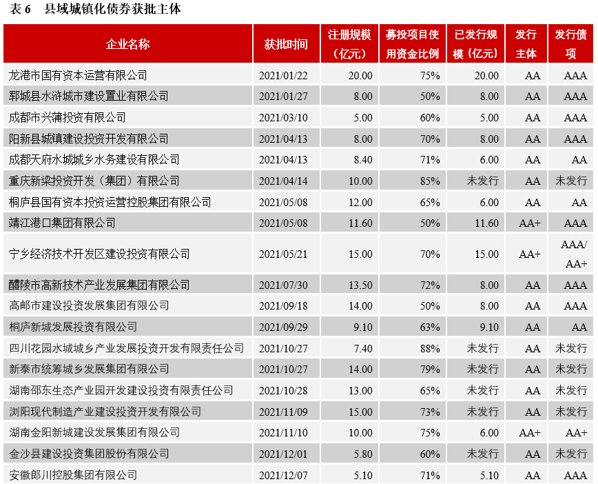 市場(chǎng)觀察:縣城新型城鎮(zhèn)化企業(yè)債注冊(cè)發(fā)行加速。自2021年1月以來,發(fā)改委已批準(zhǔn)有29家企業(yè)注冊(cè)縣域城鎮(zhèn)化債券,注冊(cè)規(guī)模超過310億元。其中,2021年12月來注冊(cè)加速,分別有6家和4家主體。第一,發(fā)行較為集中,增信比例高。已發(fā)行19只,規(guī)模合計(jì)128.80億元,涉及15家發(fā)行主體。發(fā)行地區(qū)相對(duì)集中,共有13個(gè)區(qū)縣參與發(fā)行,示范縣6個(gè),占比46%,湖南和浙江發(fā)行較為積極。19只債券中,擔(dān)保比例63%。第二,募集資金用途集中在產(chǎn)業(yè)園建設(shè)和特色小鎮(zhèn)等領(lǐng)域,以區(qū)域優(yōu)勢(shì)產(chǎn)業(yè)和重點(diǎn)項(xiàng)目升級(jí)為主。2022年,隨著“共同富裕”戰(zhàn)略的推進(jìn),發(fā)展重心從脫貧攻堅(jiān)向鄉(xiāng)村振興,產(chǎn)業(yè)振興成為主要方式,本創(chuàng)新品種發(fā)行或加速。