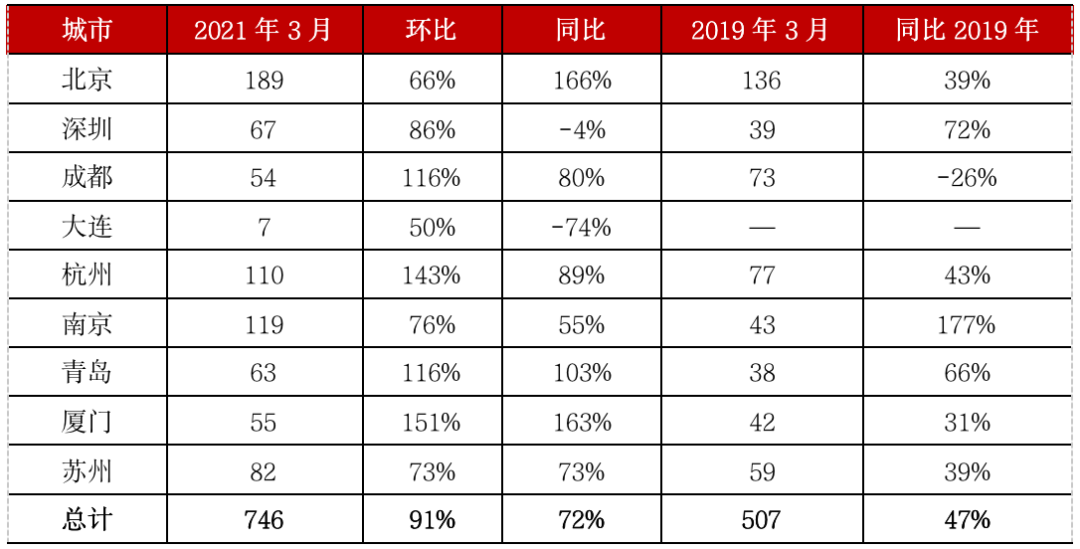 整體來看,3月全國9個重點城市二手房成交體量為746萬平方米,同比增長91%,環比增長72%。對比2019年同期,成交總量同比增長47%,其中南京同比漲幅高達177%,深圳、青島等也有6成以上漲幅。