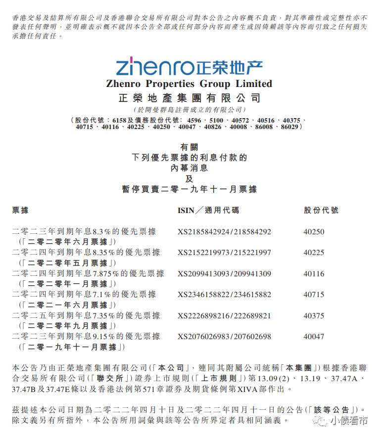 5月31日,正榮地產(chǎn)(HK6158)公告稱,受上海疫情影響,原計(jì)劃不遲于2022年5月31日支付的2020年五月票據(jù)、2021年六月票據(jù)、2020年九月票據(jù)、2020年六月票據(jù)及2020年一月票據(jù)的各自利息,不得不再次延期。