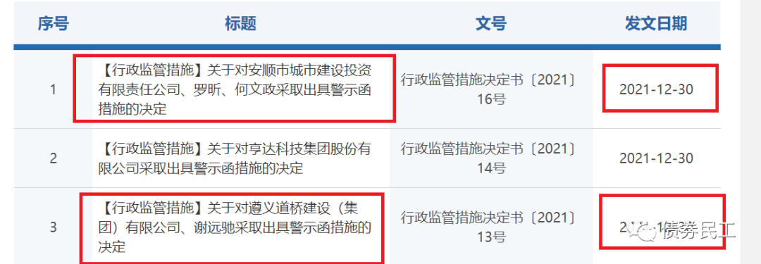 從兩家城投公司公開披露的信息來看,遵義道橋和安順城投公司收到貴州證監(jiān)局警示函措施決定的日期是一樣的。債券民工查詢了一下貴州證監(jiān)局的官網(wǎng),遵義道橋和安順城投公司兩家城投公司被采取措施的發(fā)文日期均是2021年12月30日,落款日期分別為12月24日和12月27日。