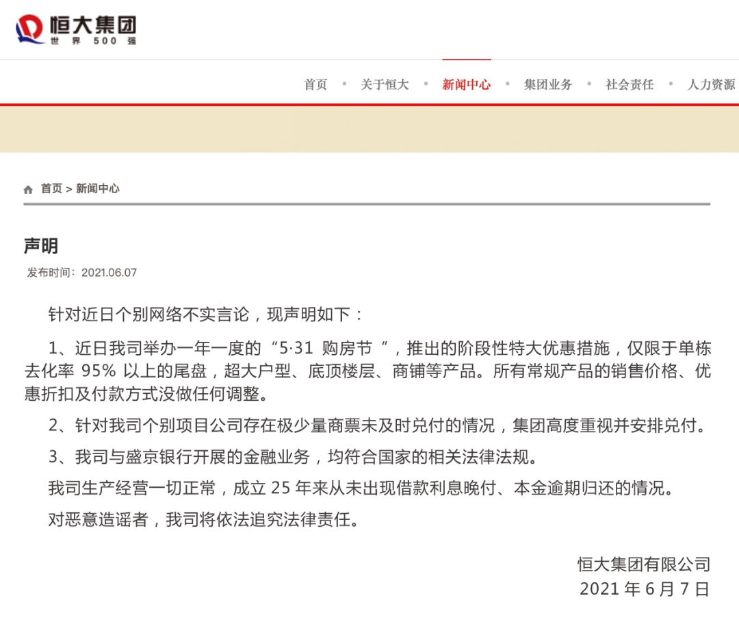然而,在恒大“大象起舞”的過(guò)程中,也出現(xiàn)了一些質(zhì)疑。6月7日,恒大發(fā)布聲明,稱公司生產(chǎn)經(jīng)營(yíng)一切正常,對(duì)惡意造謠者,將依法追究法律責(zé)任。