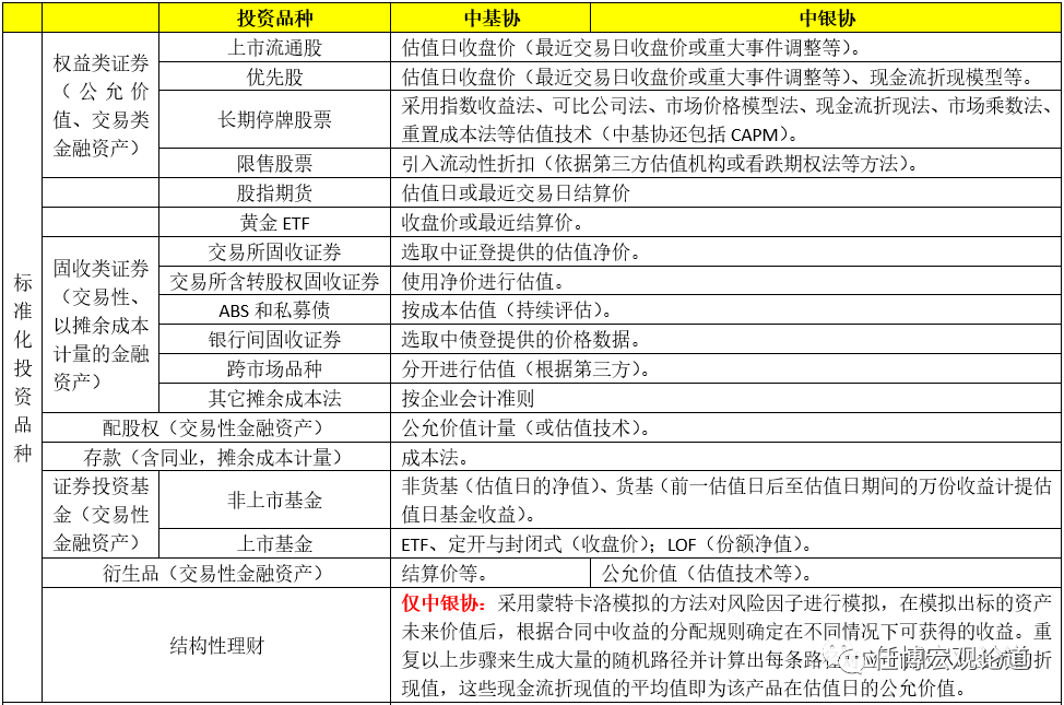 二、中基協與中銀協關于資管投資品種估值標準的對比