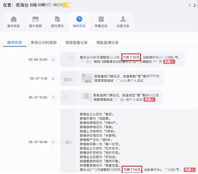 南山后海的觀海臺,兩天內報價下調140萬。5月7日下調110萬,5月8日業主再下調30萬。