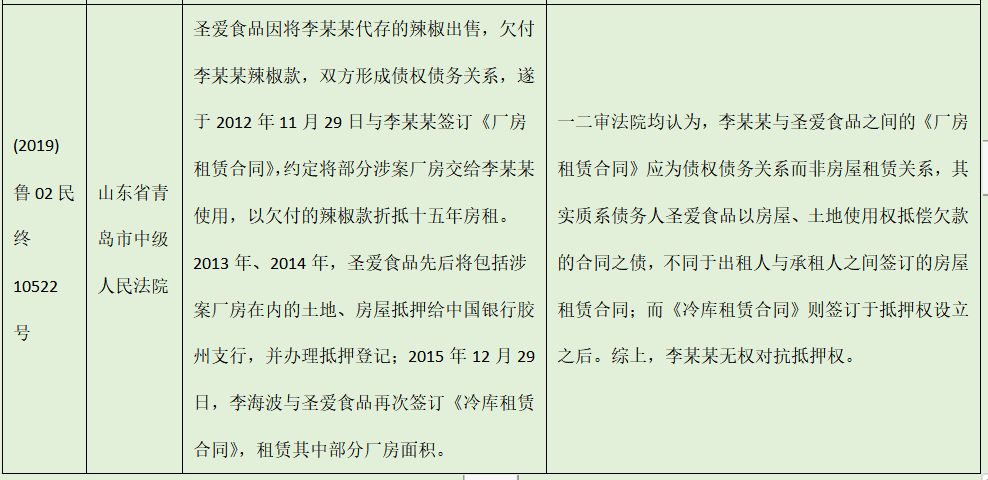 筆者評(píng)析:在上述三個(gè)案件判決中,法院在認(rèn)定是否適用“買賣不破租賃”/“抵押不破租賃”時(shí)均考慮了租賃關(guān)系的真實(shí)性,不具備租賃實(shí)質(zhì)的《租賃合同》并不能產(chǎn)生對(duì)抗抵押權(quán)的效力。如在(2014)民申字第215號(hào)以及(2019)魯02民終10522號(hào)案件中,法院均認(rèn)為“以租抵債”形成的法律關(guān)系僅是一般債權(quán)債務(wù)關(guān)系而非租賃合同關(guān)系,不能對(duì)抗。但是,如果上述案件中,承租人在前述“以租抵債”合同后,便實(shí)際占有使用涉案廠房,那么是否還應(yīng)一律不認(rèn)定為租賃關(guān)系,恐怕值得商榷。