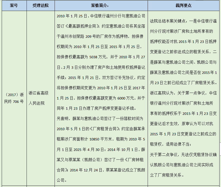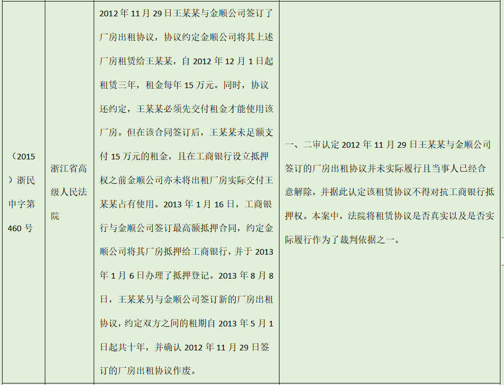 雖然《物權(quán)法》的規(guī)定存在一些模糊的地方,但部分法院在實(shí)操案例中,對(duì)如何認(rèn)定“抵押權(quán)與租賃權(quán)”的順位關(guān)系,也作出了自己的裁判觀點(diǎn),《民法典》的修改可以說一定程度上對(duì)此進(jìn)行了吸收。本文對(duì)前述部分裁判觀點(diǎn)進(jìn)行了總結(jié),希望對(duì)讀者有所啟發(fā)。