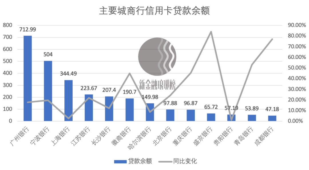 從信用卡貸款余額來(lái)看,僅有不到10家城商行超過(guò)了100億元。截至去年末,廣州銀行以712.99億元位列榜首,寧波銀行也達(dá)到了504億元,發(fā)卡量最高的上海銀行排在第三位,貸款余額為344.49億元。