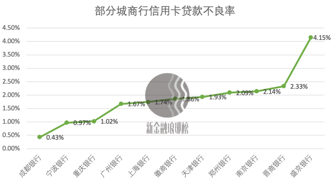 從信用卡資產(chǎn)質(zhì)量來(lái)看,頭部城商行整體表現(xiàn)良好。至去年末,成都銀行、寧波銀行與重慶銀行表現(xiàn)最佳,其信用卡貸款不良率分別為0.43%、0.97%、1.02%。