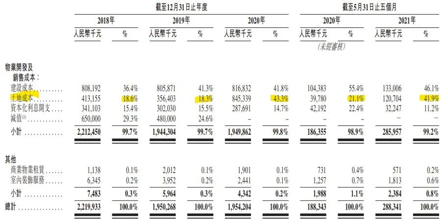 有趣的是,方直發(fā)展的物業(yè)開發(fā)及銷售成本中,土地成本占比波動比較大。