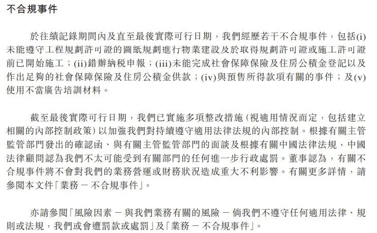 (i)未能遵守工程規(guī)劃許可證的圖紙規(guī)劃進行物業(yè)建設(shè)及于取得規(guī)劃許可證或施工許可證前已開始施工; (ii)錯辦納稅申報; (iii)未能完成社會保障保險及住房公積金登記以及作出足夠的社會保障保險及住房公積金供款; (iv)與預(yù)售所得款項有關(guān)的事件; (v)使用不當(dāng)廣告培訓(xùn)材料。