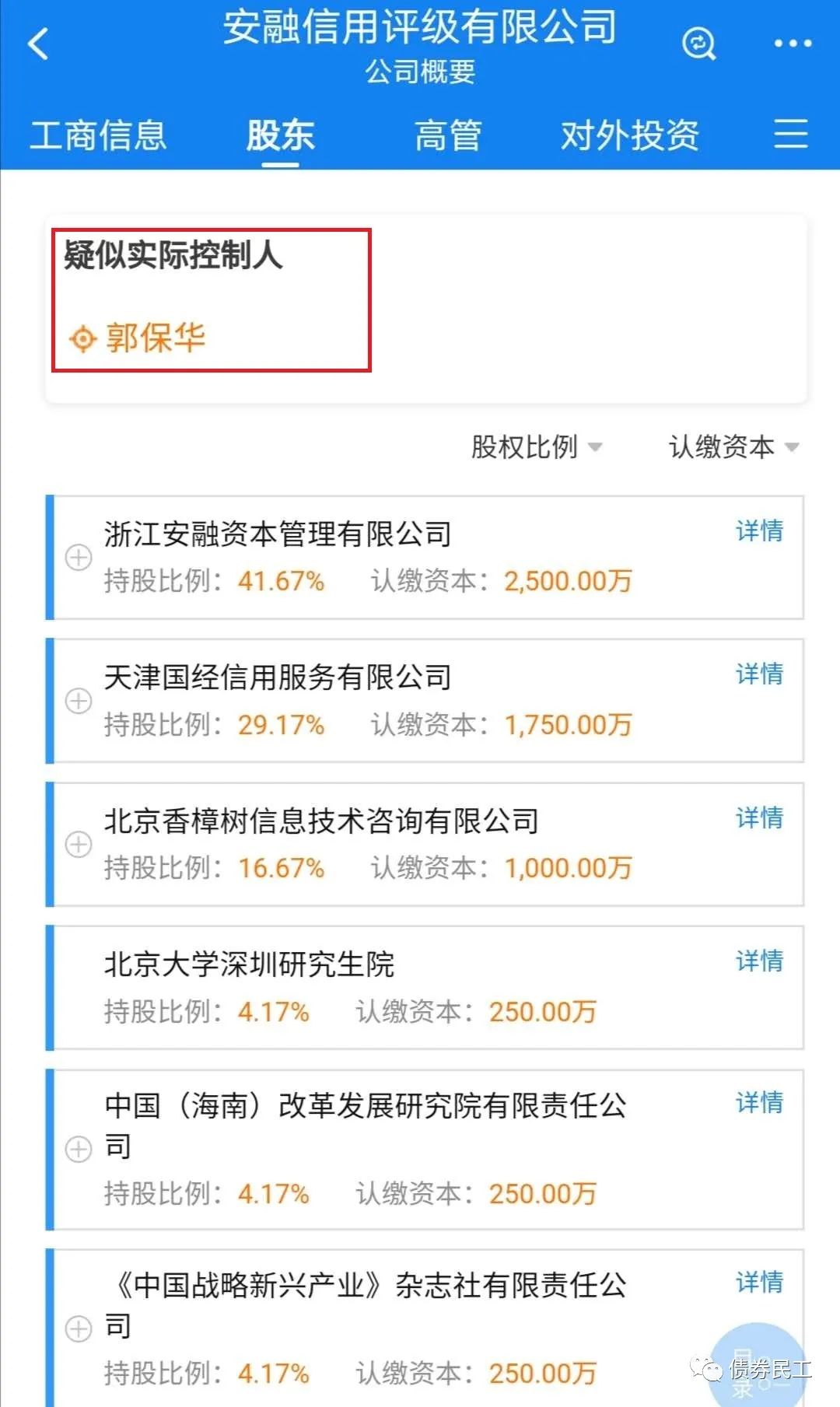 安融信評的股東為浙江安融資本管理有限公司、天津國經(jīng)信用服務(wù)有限公司、北京香樟樹信息技術(shù)咨詢有限公司、《中國戰(zhàn)略新興產(chǎn)業(yè)》雜志社有限責(zé)任公司、北京大學(xué)深圳研究生院和中國(海南)改革發(fā)展研究院有限責(zé)任公司等6家法人單位,疑似實際控制人為自然人郭寶華。安融信評的股東結(jié)構(gòu)的確是很引人注意,股東包括了北大、雜志社和研究院。