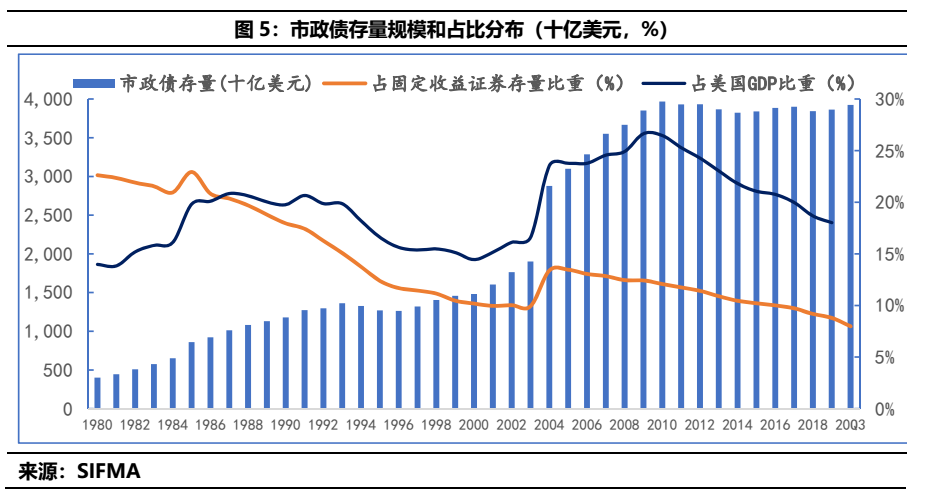 2)其次,我們介紹了當下市政債的定義以及20世紀80年代以來美國市政債的規模和現狀分析:絕對規模的大體穩定和相對規模漸漸下滑,似乎是城市化和工業化到了一定進度上的體現,但其仍扮演者極為重要的角色。