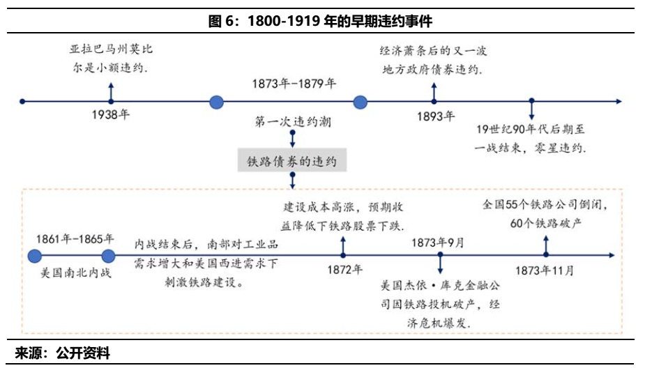 從發展來看,1873年爆發的世界經濟危機持續時間長、規模大,對美國的建筑業沖擊較大;同時由于市政債項目收益均低于預期的背景下,市政債爆發第一波大面積違約潮。據相關資料顯示,1873年至1879年,多達1/4的州和地方政府債券發生違約,主要系鐵路、房地產開發和其他基礎設施建設未能提供預期的收益。