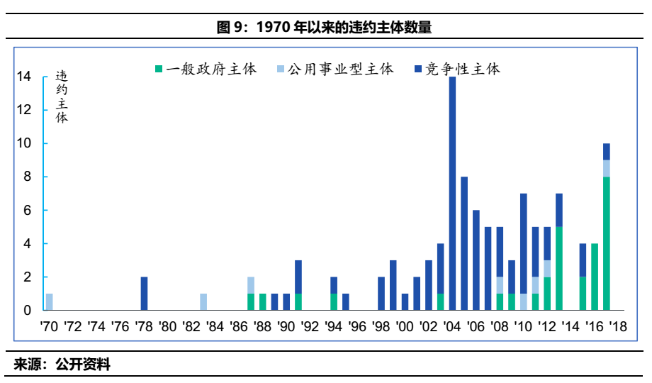 從違約主體的時間序列分布來看,1970年-2019年違約主體合計113家,其中一般政府主體29家,公用事業型主體8家,競爭性主體76家。20世紀80年代末和90年代初存在一波違約潮,但規模有限;但臨近進入21世紀開始,市政債違約主體的數量開始攀升,其中2004年與2017年分別是兩個峰值點。