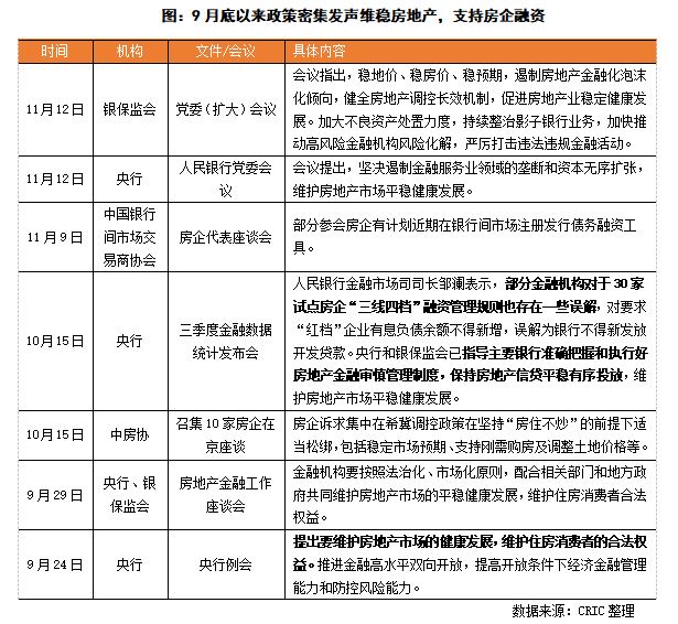 9月末央行首次提及“兩個(gè)維護(hù)”,指導(dǎo)銀行準(zhǔn)確把握和執(zhí)行好房地產(chǎn)金融審慎管理制度,保持房地產(chǎn)信貸平穩(wěn)有序投放,維護(hù)房地產(chǎn)市場平穩(wěn)健康發(fā)展。10月15日,中房協(xié)召集了10家房企在京座談,住建部相關(guān)部門人員參與主持,據(jù)透露,房企的主要訴求集中在希冀調(diào)控政策在堅(jiān)持“房住不炒”的前提下適當(dāng)松綁,包括穩(wěn)定市場預(yù)期、支持剛需購房及調(diào)整土地價(jià)格等。此后,央行和銀保監(jiān)會又多次提及促進(jìn)房地產(chǎn)行業(yè)穩(wěn)定健康發(fā)展。在此情況下,政策端風(fēng)向有所緩和,從宏觀上對房地產(chǎn)信心重塑有所推進(jìn),維穩(wěn)房地產(chǎn)。