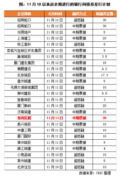 銀行間商協(xié)會座談會后,眾多房企密集發(fā)行中期票據(jù)和超短融資券。11月10日,常州城建、北京住總、小商品城宣布擬發(fā)行超短融資券,鎮(zhèn)江城建公告擬發(fā)行4億元的中期票據(jù);到11月11日,保利發(fā)展宣布擬發(fā)行20億元的中期票據(jù),將銀行間債券市場的融資主體從城投擴(kuò)展到主流房企,而后11月12日,光明地產(chǎn)宣布擬發(fā)行5億元中期票據(jù),招商蛇口公告擬分別發(fā)行30億元的中期票據(jù)和超短融,企業(yè)融資“冰凍”狀態(tài)有所緩解。