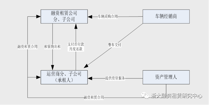 這一模式采用了直租,由融資租賃公司作為出租人向經銷商采購車輛,車型全部為同一車型,車輛完成登記上牌后,統一交付至承租人日常運營,同時委托平臺運營商作為資產管理人,負責對車輛的日常運營情況進行監控管理。